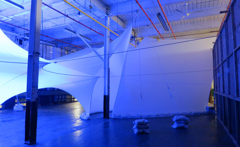 Inspired by the weightless moment of takeoff, the installation beckons viewers to enter between two continuous planes of fabric. Starting from a constrained, vertical position, the fabric twists to reveal a seemingly limitless expanse.